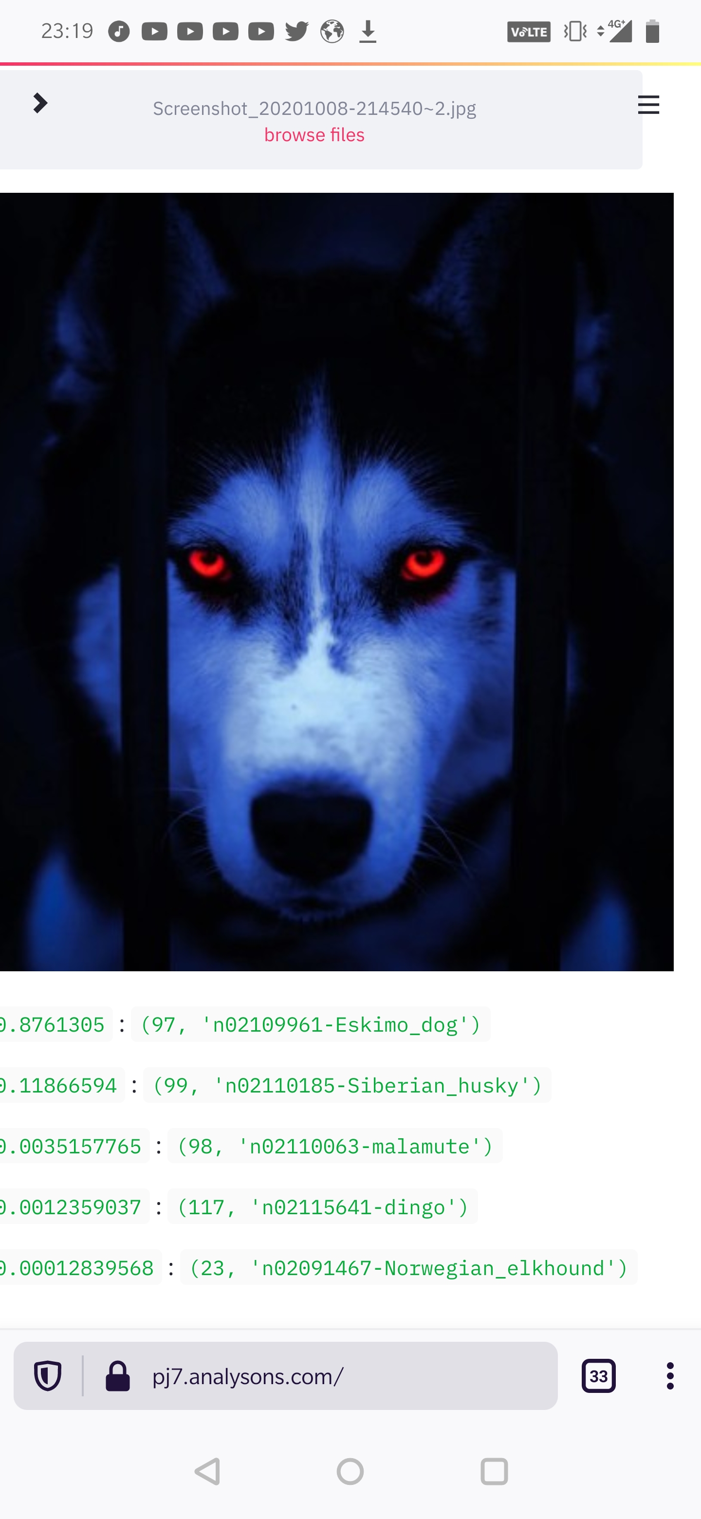 Ce chien aux yeux rouges un peu surnaturels est reconnu à juste titre comme un Eskimo dog à 87% de probabilité et comme un Siberian Husky (une race qui ressemble beaucoup à l’Eskimo dog) à 12%.